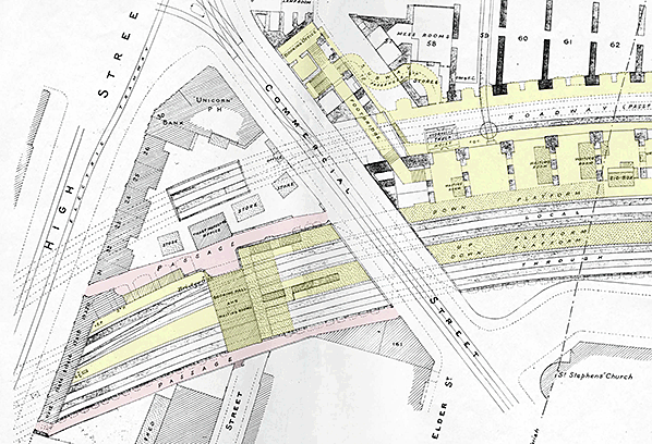 ![]() 1910 plan of Bishopsgate station clearly shows the layout of both the original booking office and platforms and the 1891 Commercial Street entrance and routes to the Suburban line platforms and the original Down local platform. Note the various waiting rooms and other facilities located between the Up Suburban and Down Local platforms. A lot of the features shown in this plan are part of the goods station in the two levels above. The room adjacent to the 1872 booking office is a ticket inspector’s office. Click here for a large version.