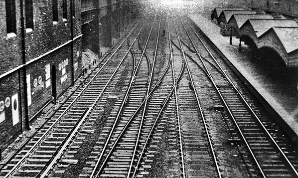 Photo by Ken Nunn ![]() Another view of the Up Main line platform at Bishopsgate this time looking east from the Up signals probably in the first decade of the 20th century. The distinctive ridge-and-furrow awning with saw-tooth valance that protected much of the platform is seen here. The platform is overshadowed by Bishopsgate goods depot which is seen on the right. The three east end crossovers are seen in the middle distance.