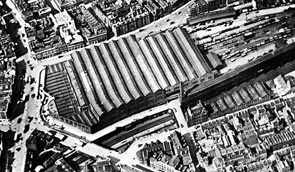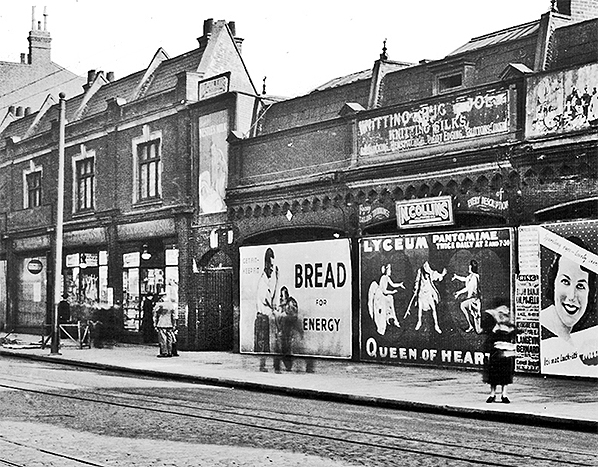 ![]() GER shops in Shoreditch High Street in 1939. Between the two parades of shops the arched entrance to Bishopsgate station is seen. This was not the original entrance from Shoreditch High Street. The shops on the right were built by the GER in 1874, prior to their building the footway started alongside the line.