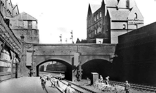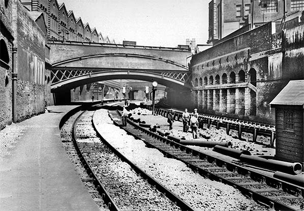 Photo from JE Connor collection ![]() A view from the former Down Local platform towards Bethnal Green probably taken on the same day as the photo above. Pipe laying, probably for drainage, is ongoing on the site of the former island platform as is, apparently, re-ballasting work. Ahead of the camera is Bridge No. 12, Commercial Street, 34 chains from Liverpool Street, with its ornate cast iron arch. The wall above the arch has received bracing but the reason is unknown. Possibly the bridge had received minor damage during WWI air raids. In September 1915 Zeppelin L13 dropped bombs on Liverpool Street station and its environs and on 6 July 1917 Bishopsgate station was bombed but without casualties or any crippling damage. Surviving records show there were nine WWI bomb incidents in the vicinity of Bishopsgate station of which two were at, or extremely close to, the Low Level platforms. Commercial Street bridge survived the 1949 Shenfield electrification, unlike Wheler Street (now Braithwaite Street) bridge seen here in the background which had to be rebuilt with a flat deck. The bridge preceding Commercial Street, No. 11, was removed in June 1930 and the resulting gap in bridge numbering exists to this day. Bridge No. 11 was that which carried a ticket office and waiting room. It was located at the north end of Blossom Street, behind the camera in this view, and accessed via a staircase. Bishopsgate South signal box can be seen beyond Commercial Street bridge, seemingly hiding rather sheepishly as a result of limited space. There were also waiting rooms located in the arches on the left. Beyond Wheler Street bridge it is just possible to discern the 1 in 70 Bethnal Green bank. The post-mounted circular devices, or which two are visible, are banner repeater signals. These are installed where curves and structures obscure the sighting of the signals they repeat. Such repeater signals at one time abounded in the Liverpool Street area. They take the form of a black bar on a white background disc, the disc partially rotating so the black bar mimics the arm of a regular signal. On the repeater facing the camera in this view the black bar is not visible. Where these repeaters still exist today, the replacement of mechanical signalling has seen them superseded by electronic LED versions,