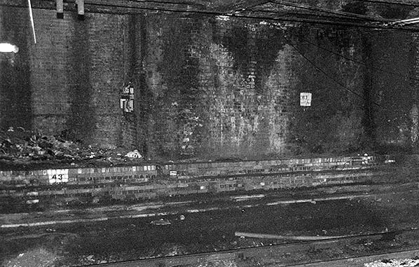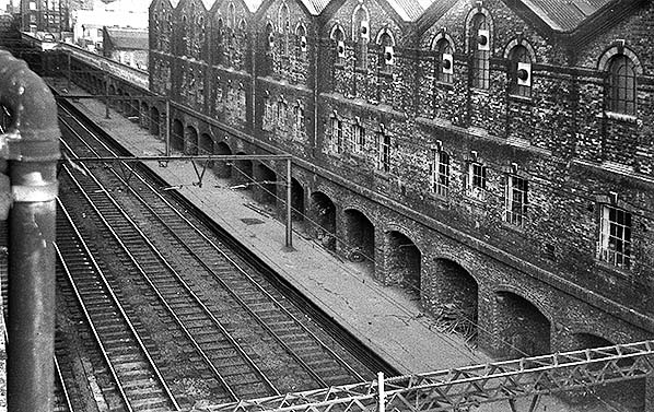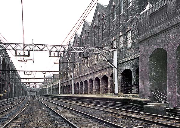 Photo by Nick Catford ![]() Bishopsgate station Up Main line platform is seen in December 1994 looking east towards Bethnal Green. The station is sandwiched in a deep cutting between Bishopsgate goods station and the GER Quaker Street stables.