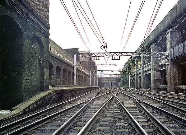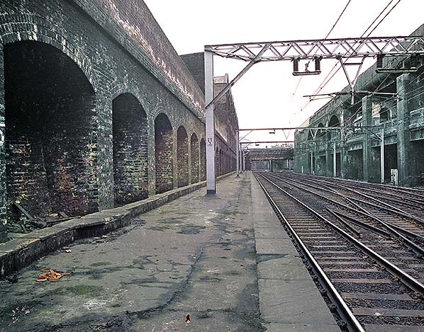![]() Photo by Nick Catford ![]() Looking west along the up main line platform at Bishopsgate station in December 1994.