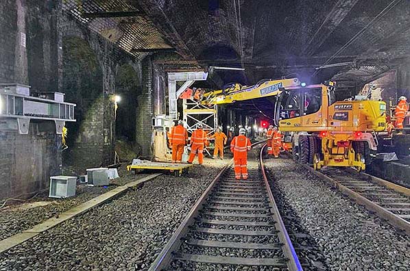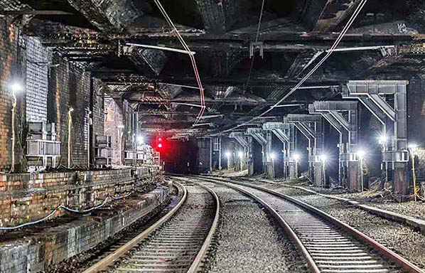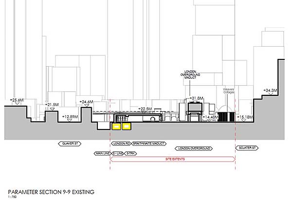 ![]() Photo From J Murphy & Sons ![]() Cross section of the Bishopsgate goods station site. The Liverpool Street is on the left with the new London Overground viaduct on the right. The Suburban lines (Bishopsgate tunnel) are shown in yellow.