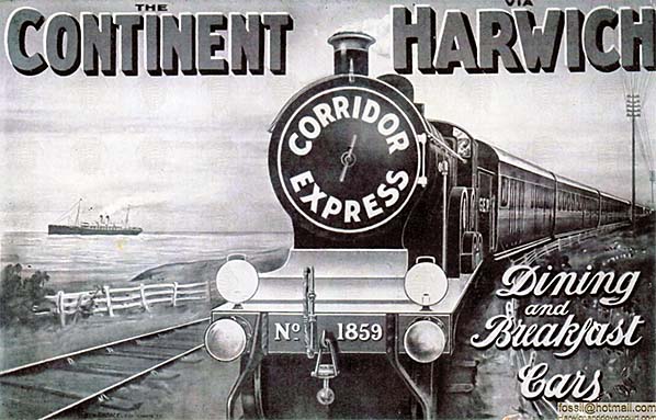 Four of the six display a representation of a locomotive and this poster was headed "The Continent via Harwich", in other words "The Hook of Holland Express" which had carriage roof boards but is not known to have carried a locomotive headboard. The locomotive depicted on the poster was 4-4-0 No. 1859 and this number was shown very boldly. Although the artist could have pre-empted the introduction of this locomotive, which was new ex-works in April 1904, it is more likely the poster dated from very soon after the locomotive's introduction to traffic. After all, railway companies liked to depict their latest in their publicity material. Also of note is these five posters appearing clean and bright suggesting they were very recent, hence the "1904 or shortly afterwards" dating. The 'Polo mint' device on No. 1859's smokebox door shouted "Corridor Express"; corridor trains still being somewhat upmarket at the time. The poster also shouted "Dining and Breakfast Cars", which in reality was the same vehicle, or vehicles, serving dinner in the Down direction and breakfast in the Up direction. Of course, shouting "Corridor Express" informed potential passengers they could access the catering regardless of where they sat in the train. This poster was also issued in postcard form, something the GER was fond of doing and especially when their shipping was the subject