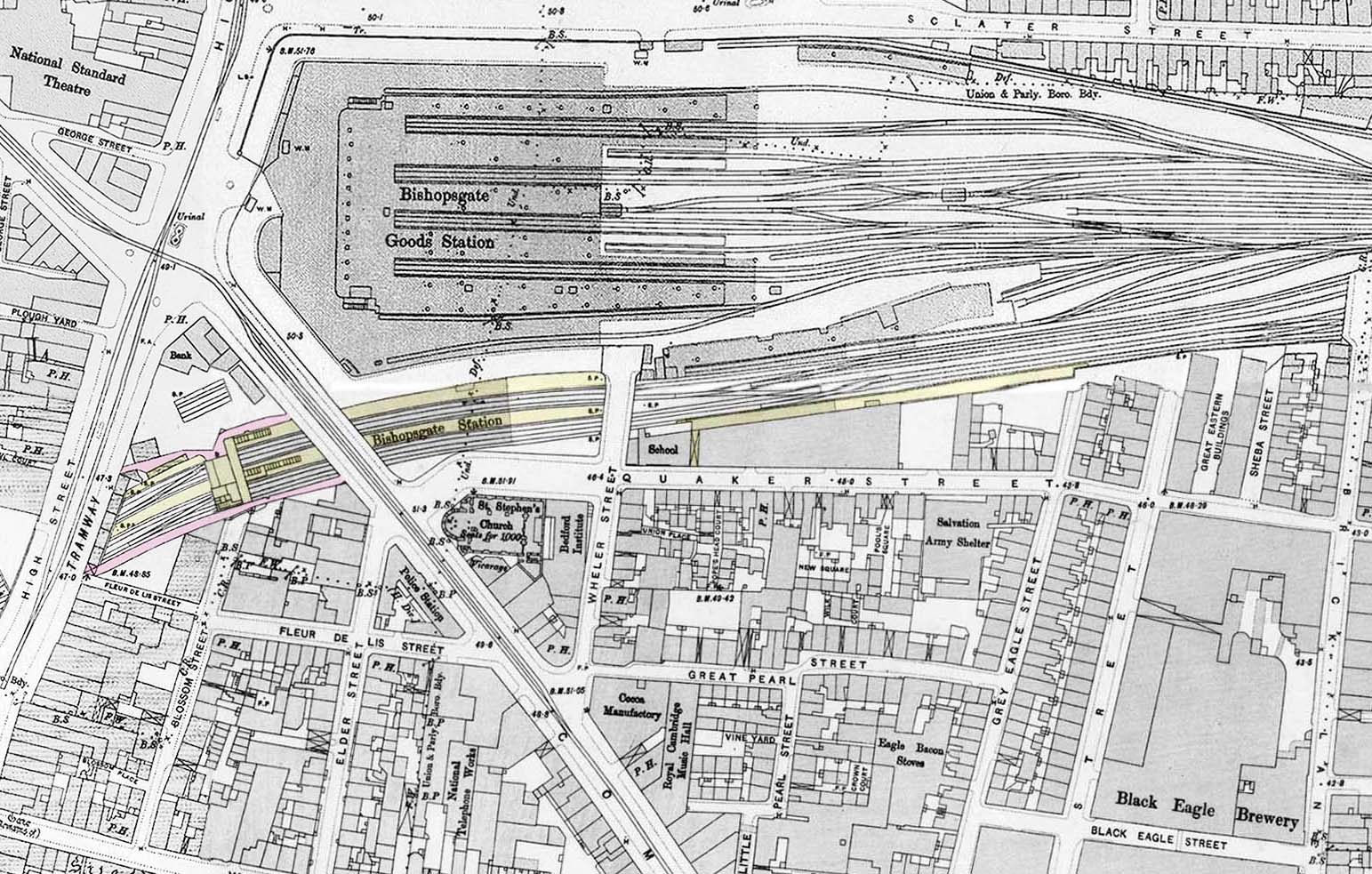 1896 1:1056 map shows the layout of Bishopsgate Low Level station and the adjacent Bishopsgate Goods Station. Platforms and station buildings are highlighted in yellow and the access footways linking Commercial Street and Shoreditch High Street are highlighted in pink. There was access for cars and cabs with a station yard on the north side. The long building in the yard is an excursion booking office. The main station building straddles the line on a bridge to the west of Commercial Street. The building comprises the booking office, waiting room and refreshment room. From there steps go down to the local platforms to the north of the formation and the Down main line platform which forms an island with the Up local platform. The Up Main line platform is to the east of Wheler Street with entrance steps to Quaker Street at its east end. This platform had no booking office and was primarily intended for alighting passengers only. The extent of the station canopies is shown in a darker shade of yellow. There were no buildings on the Up Main line platform other than a gents' urinal. A number of waiting rooms were built into arches at the rear of the down local platform. The Suburban lines and booking office are not shown although a short section of open cutting immediately north of the booking office indicates where they run.