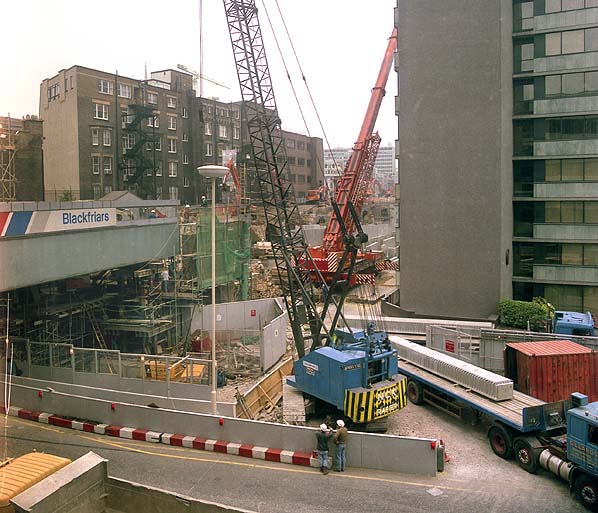 Looking north from Blackfriars Station in May 1990 during the building of St. Pauls Thameslink Station Photo by Nick Catford