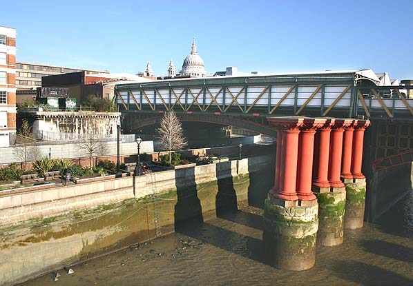 Blackfriars Station seen from Blackfriars road bridge in December 2005. The supporting piers and abutment for the 1864 railway bridge are in the foreground Photo by Nick Catford