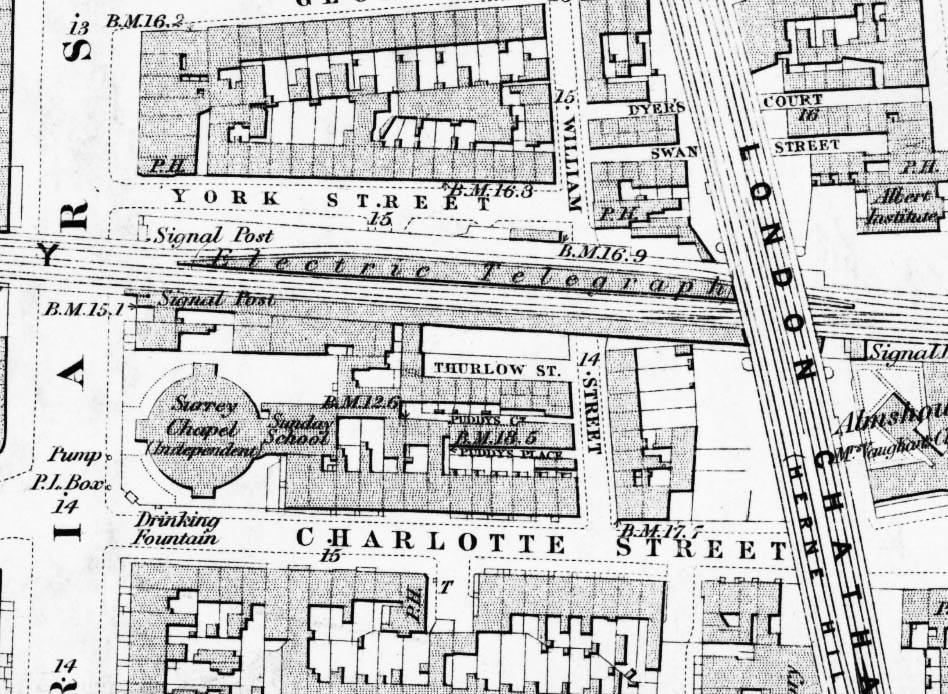 ![]() Station Name: BLACKFRIARS (SER Station)![]() 1879 1:2,500 OS map. Although this map was published 10 years after the station closed the platforms are intact. A side platform was originally planned for the north side of the formation but as no platform is shown here there is some doubt as to whether the platform was ever built. There is a clear widening of the viaduct to accommodate the platform. Blackfriars signal box is seen on the right