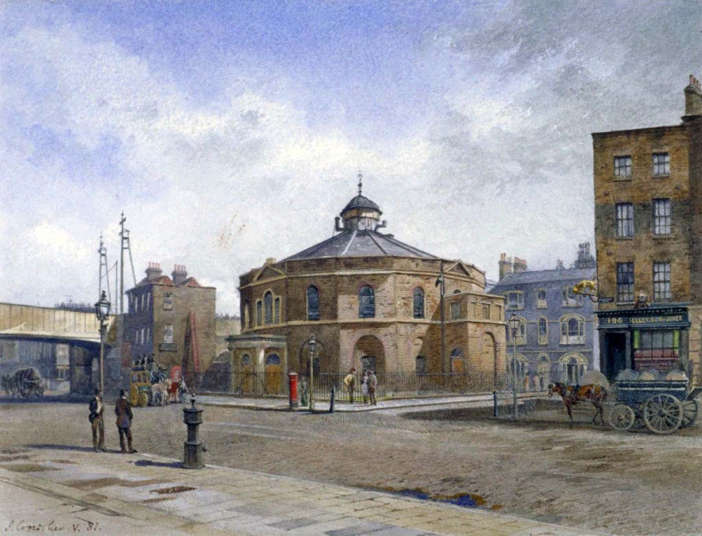 An 1881 painting showing a similar view to the engraving above. Again the entrance to Blackfriars station is visible under the bridge.
