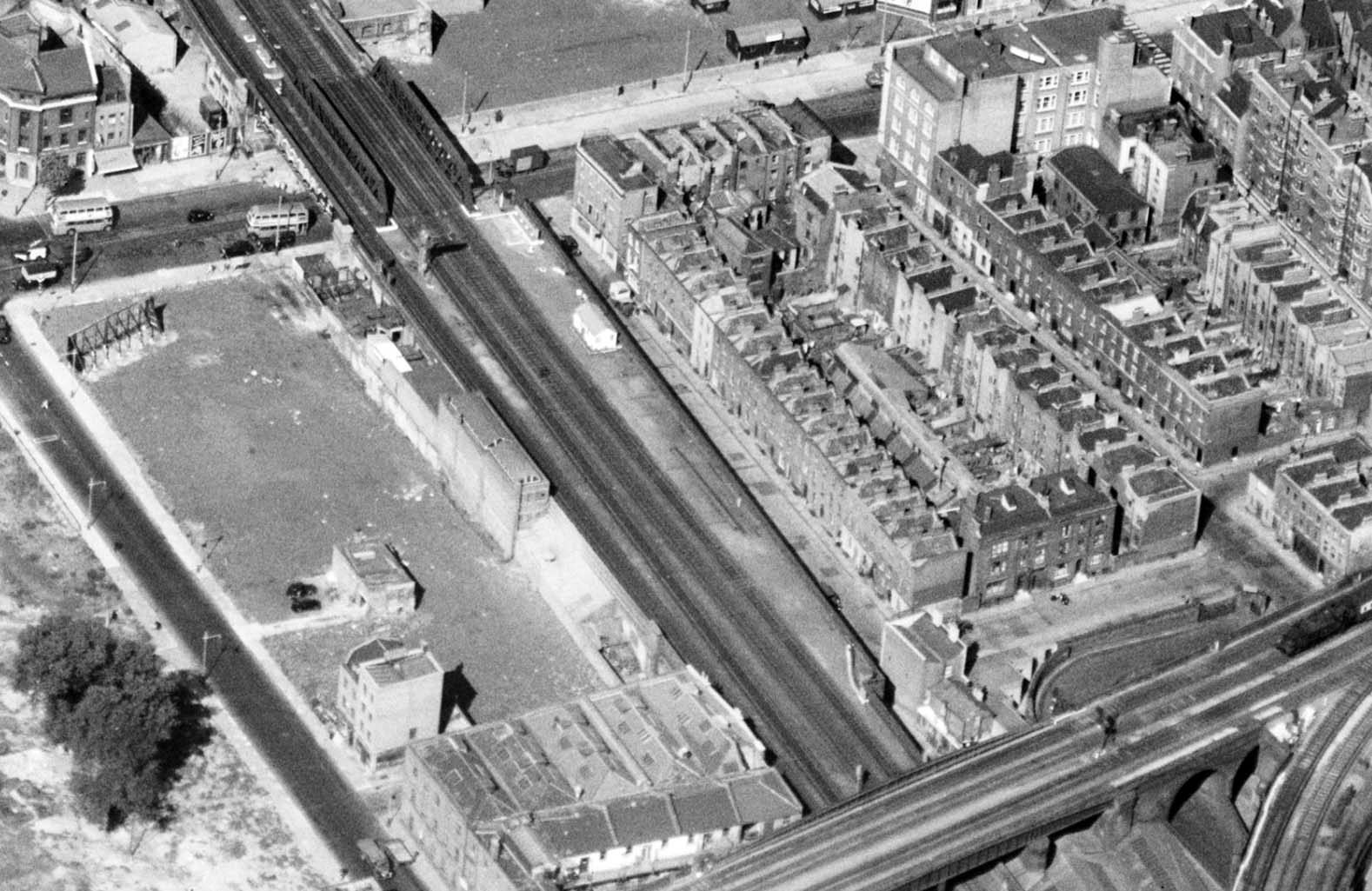 ![]() Station Name: BLACKFRIARS (SER Station)![]() Aerial view showing the site of Blackfriars station in 1952. The widening of the viaduct for the north side platform is very obvious. The bomb damaged buildings in Charlotte Street to the south of the line have been cleared. This includes Revd. Roland Hill's Surrey Chapel which opened in 1783 and became a boxing arena known as The Ring in 1910.