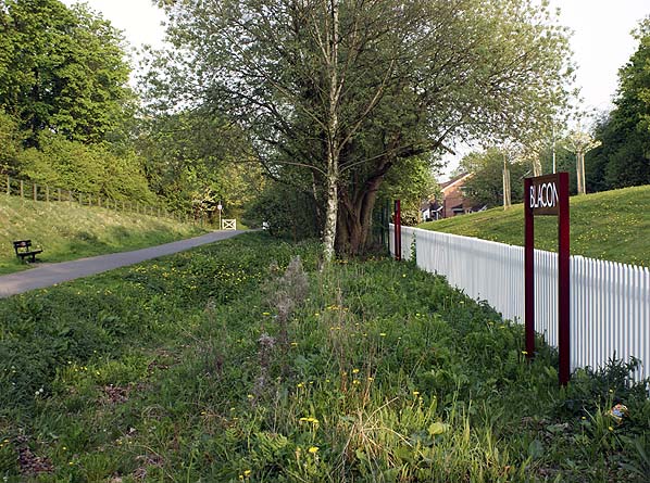 ![]() Station Name: BLACON![]() Looking east along the former westbound platform at Blacon station in April 2011. The sign is not an original from the time of the station. It had been added to show that the site was once a station.