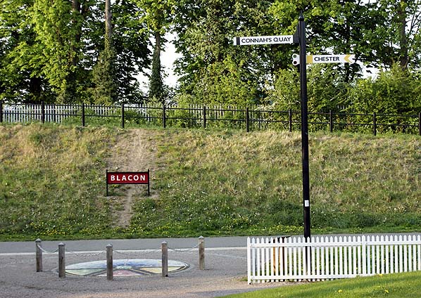 ![]() Station Name: BLACON![]() Looking north towards the site of Blacon station in April 2011. The station building had been in the foreground, its main entrance being roughly opposite where the photographer was standing. The railway signal style sign points to the destinations that since the year 2000 could be reached by the cycleway along the trackbed of the former Chester Northgate to Shotton line.