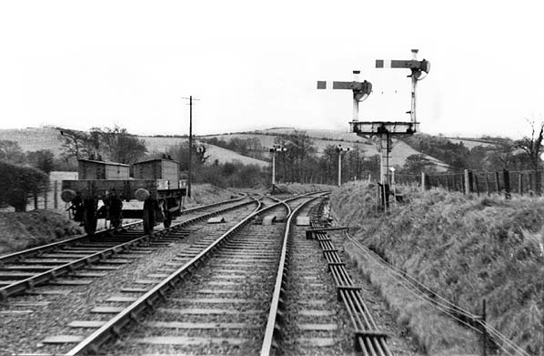 Copyright photo by from the John Alsop collection ![]() Looking south-west away from Blodwell Junction staion in 1948. The junction after which the station was named is clearly illustrated as are its contolling home signals. The lower signal arm controlled access to the Nantmawr branch to Llanymynech which can be seen curving off to the left. The taller arm controlled access to the Tanat Valley Light railway route to Llangynog. When this view was taken it was not possible for trains to reach Llanymynech as the line had closed as a through route in 1925. A stub of it had been retained for shunting purposes.