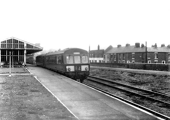 ![]() This view is believed to be from 1964. As closure approaches the goods sidings, formerly to the right, have been lifted, and the lighting on the platform in the foreground has been removed. A DMU (destination unclear) stands at the southern face of the island platform.