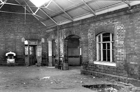 ![]() Blyth station concourse, looking north c1968, several years after closure to passengers. The ladies’ waiting room retains its sign. The more modern brickwork (right, foreground) enclosing an window frame dates from c1933 when the station entrance was relocated to the north, and a new booking office was placed behind the window and linked with the parcels office.