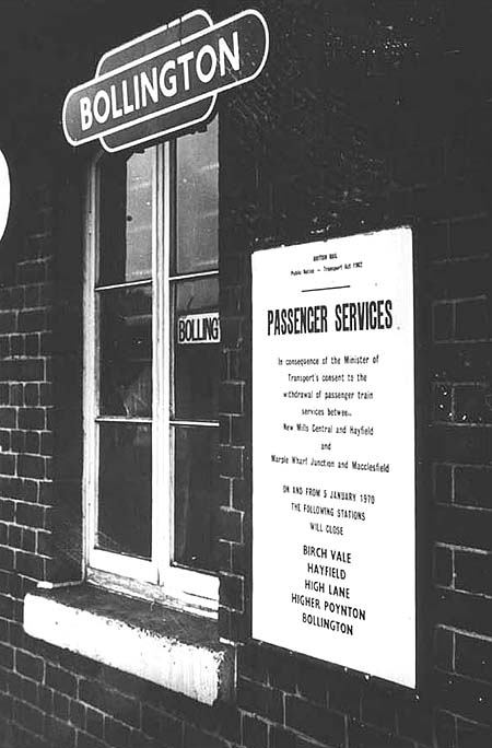 Withdrawal of passenger services notice at Bollington station seen in late 1969.
