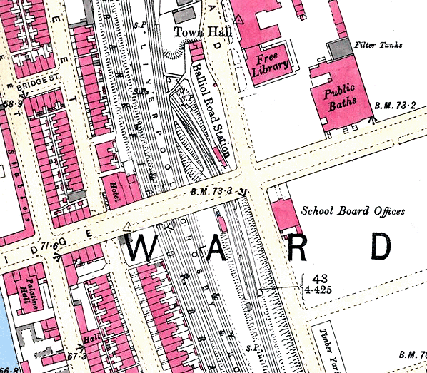 Balliol Road station opened with the branch. The entrance to the station was, as the name would suggest, on Balliol Road where the Bootle Town Hall was situated. Passengers entered the station via a single storey brick building located on the western side of Balliol Road. The building contained waiting rooms and a booking office.