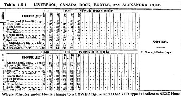 In summer 1932 there were 11 trains to Alexandra Dock and 13 to Liverpool Lime Street on Monday-to-Saturday only. The first departure from Balliol Road was for Alexandra Dock and it left at 6.53am. The last departure was also for Alexandra Dock at 10.43pm.