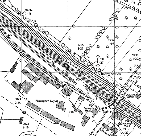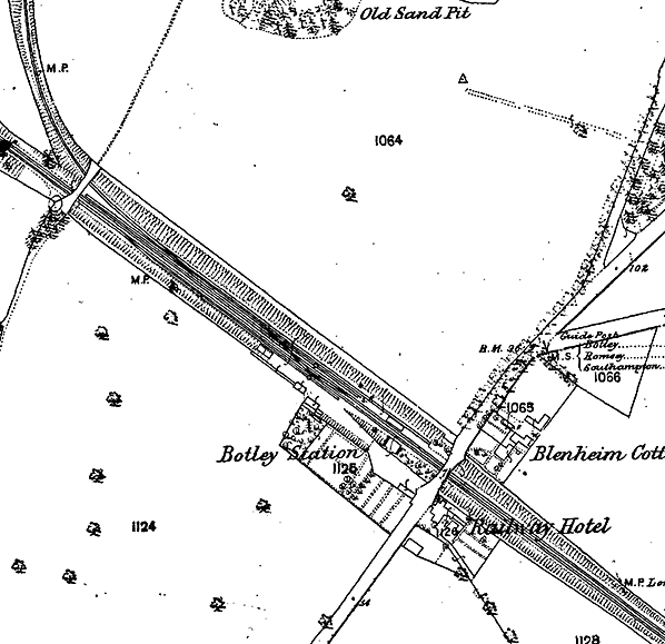 As built, Botley had two facing platforms largely on the west side of Station Hill but extending for a short distance on the east side of the road. On 1 June 1863 Botley became a junction, following the opening of the Bishops Waltham branch which ran into a new bay platform on the down side. At that time, the Botley stationmaster James Whitney was also responsible for the station at Bishops Waltham.