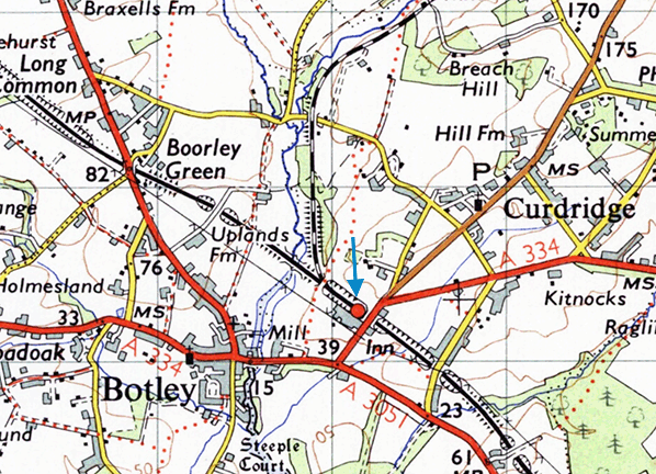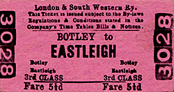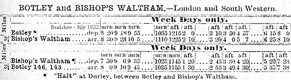 In 1839 the London & Southampton Railway Company presented a Bill to Parliament to construct a new line from a junction with their London to Southampton line at Bishopstoke (later Eastleigh) to Gosport via Botley and Fareham. Despite some local opposition, the Bill was passed and construction was quickly underway. The London & Southampton Railway changed its name to the London & South Western Railway in June 1839. At Botley, contractor Thomas Brassey had difficulty finding firm ground and before the station could be built wooden piles had to be driven into the ground to provide a solid foundation for the station building. Botley station was sited ¾-mile east of the town and was actually in the parish of Curdridge. In 1904 Curdridge parish council asked the L&SWR to add Curdridge to the station name but its request was refused.