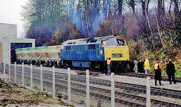 ![]() A test train of sheeted-down Procor wagons hauled by Class 52 ‘Western Rifleman’ beneath the newly-built hopper at Botley early in 1973. The hopper has been built over the Bishops Waltham branch line.