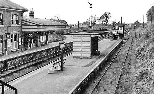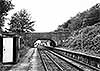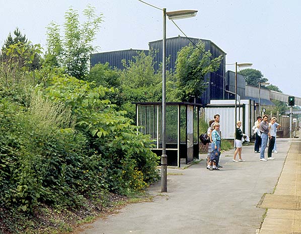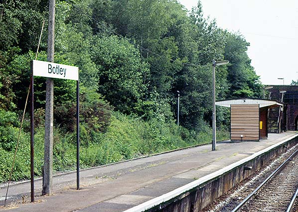 Photo by John Mann ![]() Botley station down platform seen from a passing westbound train in June 1986. The waiting shelter is original but substantially shortened.