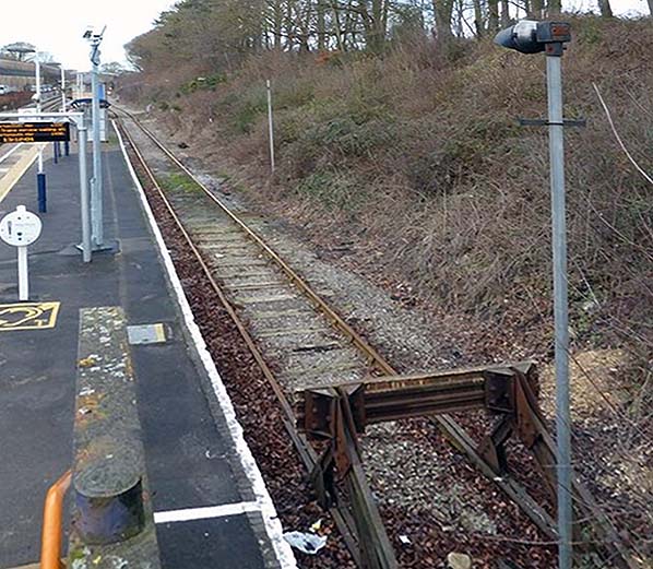 ![]() The track into the Bishops Waltham bay platform at Botley has been retained as part of Foster Yeoman's long siding. It is seen here in February 2011.