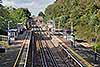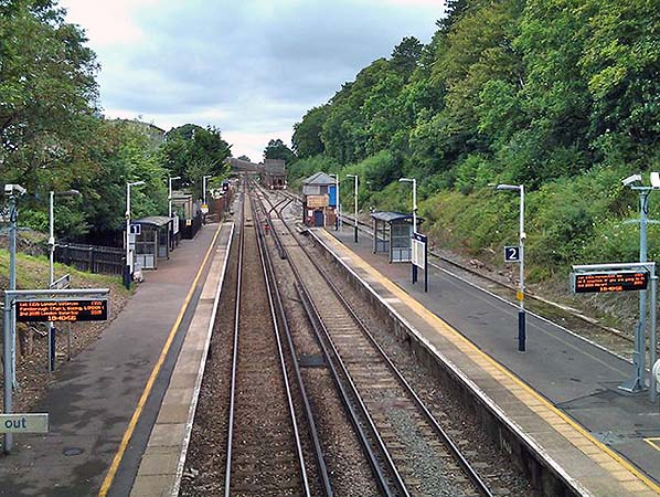 ![]() Botley station looking north-west from the footbridge in August 2011. The original down platform shelter and the 1970s up platform bus shelter have been replaced with two brushed-steel and glass shelters.