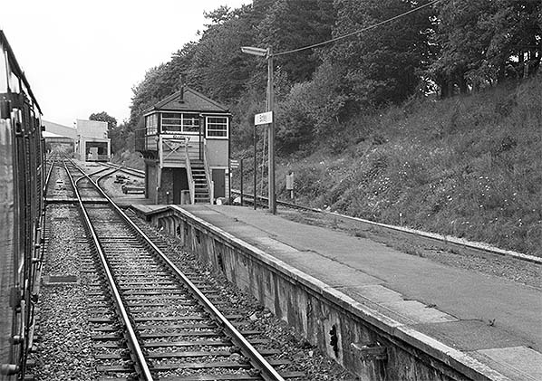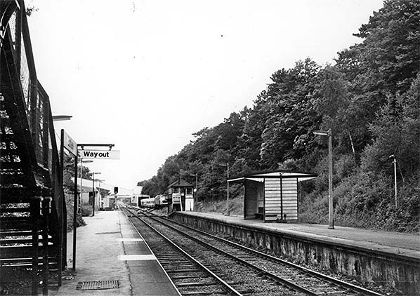 Photo by Alan Young ![]() Botley station up platform seen from a passing westbound train in June 1986. The Foster Yeoman aggregate depot, which is on the site of the goods yard, towers above the station.