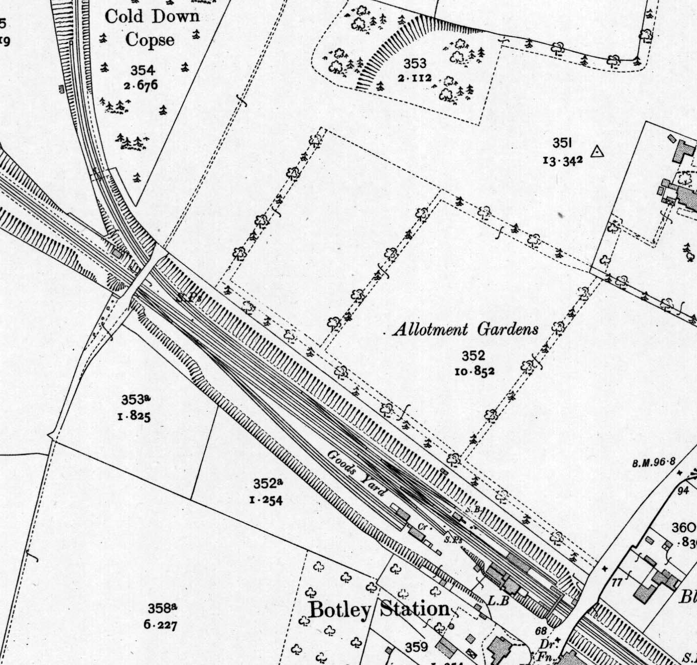 1909 1:2,500 OS map shows substantial changes and additions. The goods yard has been expanded with two new parallel sidings running along the south side of the dock. There is also a down siding running for a short distance along the Bishops Waltham branch. A crane (Cr) is identified in the yard standing on the dock close to the goods shed. The rectangle to the left of the goods shed is a livestock pen. The waiting room with a canopy is now shown on the west side of the main station building; this was built in 1884. A small building has appeared on the approach road, just to the west of the station building; that is a fruit traffic office. Beyond this building, the road into the yard has been widened; this was done in 1892 to stop bottlenecks in the strawberry season. A footbridge now spans the two platforms; this was also built in 1884. A signal box, built in 1873, is seen at the west end of the down platform. 'LB' beside the station building indicates a post box, probably wall mounted. 'Dr Fn' at the top of the approach road is a drinking fountain. This was combined with a horse trough and is seen in one of the pictures below.