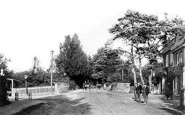 Station Hill bridge looking towards Curdridge in 1910. The station approach road runs down hill to the left, the Railway Hotel is seen on the right.