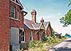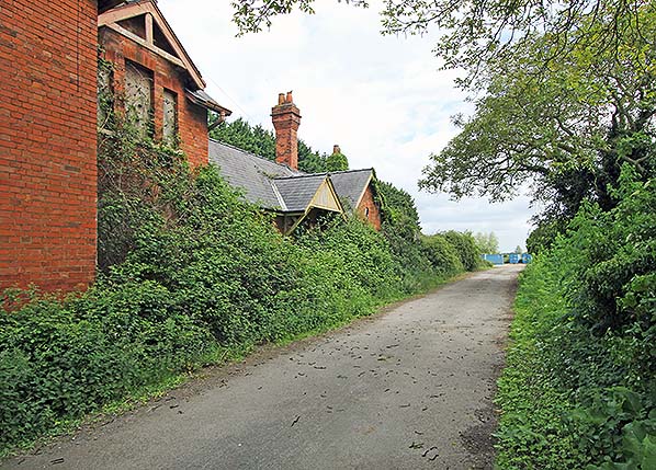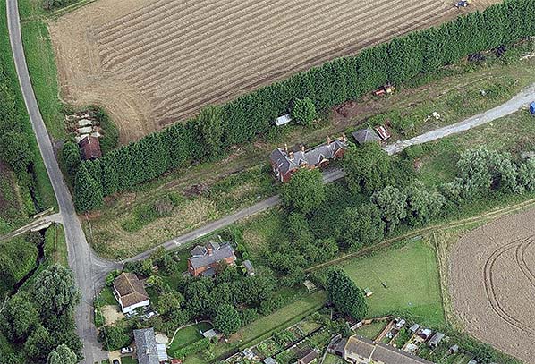 Photo by Nick Catford ![]() This undated aerial view is probably c2010. The site of the Station Road level crossing is on the right. The main station building, complete with goods lock-up, is in the centre with the down platform waiting room still standing amongst the conifers that have been planted along the down platform. Two railway cottages are seen alongside the station approach road.