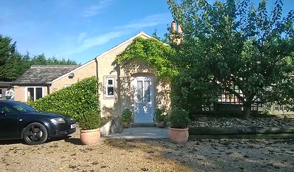 ![]() Station Name: BOURNE BRIDGE ![]() The first Bourne Road station building in October 2014. The decorated entrance was used on all crossing keeper's cottages and other Newmarket & Chesterford buildings.
