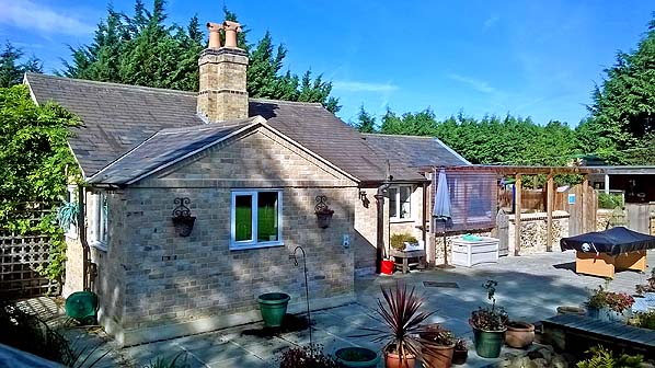 The first Bourne Road station building east side in October 2014. A gable has been added at right angles to the original cat-slide.