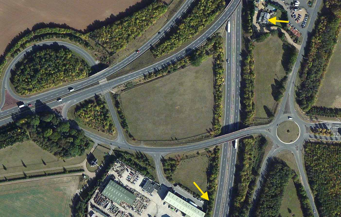 Modern aerial view showing the two station sites. The original standing building, although now extended across the track bed still stands and is indicated by the top arrow. The site of the Railway Inn is indicated by the bottom arrow. The site was lost during the widening of the A11 and construction of an improved junction with the A505. A remnant of Station Road survives as access to Solopark PLC which stands on the site of Pampisford station.