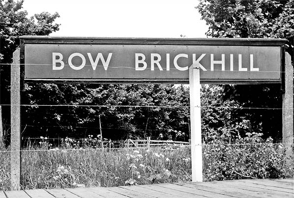 British Railways (LMR) maroon running-in board on the down platform at Bow Brickhill station in May 1970. The concrete supports were a common feature of LMR running-in boards