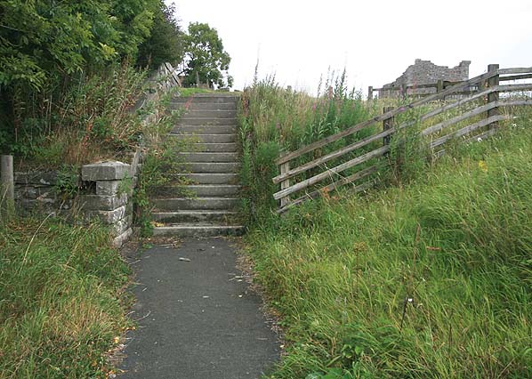 Looking up the access steps to Bowes Station in September 2007. At the top of these steps there is a farm access road and on the far side of the road a second set of steps up to the station. The goods shed can be seen on the right.