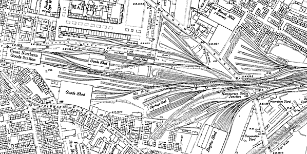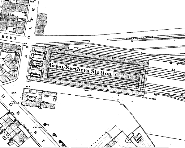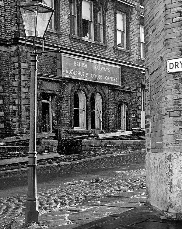 ![]() Adolphus Street station seen from Wakefield Road in May 1970. The words across the top of the building say 'Great Northern Goods & Coal Department'.
