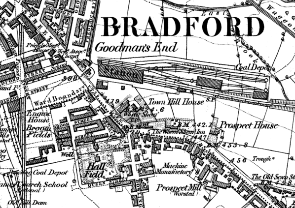 Bradford Adolphus Street Station Gallery 1: July 1937 - October 1970 ![]() Reproduced with the kind permission of Simmons Aerofilms Ltd. ![]() ![]() 1852 6" OS map showing Bradford Adolphus Street station and adjacent goods yard as built. This map doesn't shows Adolphus Street (parallel to Frederick Street), but it is shown on the map below which is based on the same 1847 survey. ![]() 1852 1:1,056 OS Town Plan shows the layout of Adolphus Street station as built. There are four platform faces comprising two side platforms and a central island. There is a central road between the two pairs of platform roads. There is a concourse at the west end of the platforms. There are waiting rooms accessed from the concourse and steps up to the booking and telegraph office. A break in the wall to the north of the trainshed is the bottom of the ramp up to the goods yard. Click here for