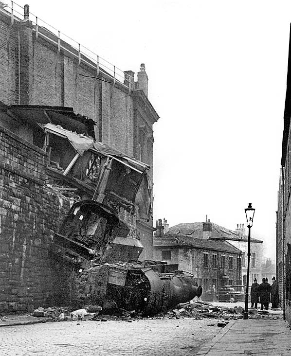 ![]() A major accident occurred on 10 November 1964 when 43072, an Ivatt 4F, was working a train of twenty-one empty wagons from Ardsley. The driver lost control at Laisterdyke and ran into Adolphus St. goods yard at an estimated speed of 50 mph. Before demolishing the buffers the crew jumped clear and the train crashed through a wall to fall 30ft into Dryden Street below. The 14 year old locomotive was considered beyond economic repair was cut up in the road 4 days later by G.W.Butler of Laisterdyke.