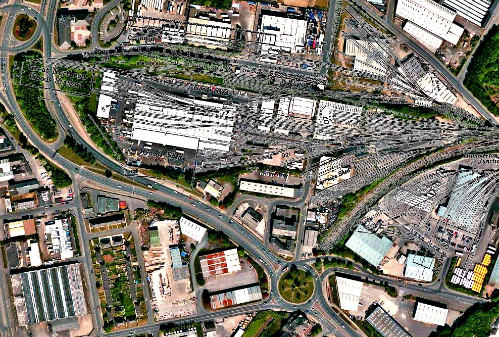 ![]() Recent aerial view of the site of Bradford Adolphus Street station and goods depot overlaid with a 1908 OS map of the station. The passenger trainshed is seen top left bisected by the new alignment of Wakefield Road. ![]()