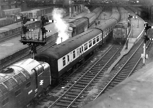 D9012 hauls an express out of Bradford Exchange station in June 1970.