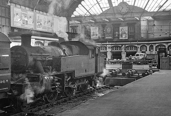 View to concorse and front screen of Bradford Exchange station in April 1961. The locomotive is an LMS Stanier Class 3P 2-6-2T.