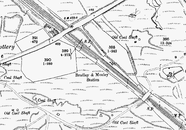 Bradley & Moxley station opened on 10 June 1862 and was a basic two-platform affair. It was located south-east of Bradley Lane. From map evidence the station was provided with a single building on the down (Wolverhampton direction) platform and one large and two small buildings on the up (Birmingham direction) platform. Access to the station was via inclined ramps from Bradley Lane. No goods facilities were provided at the station.