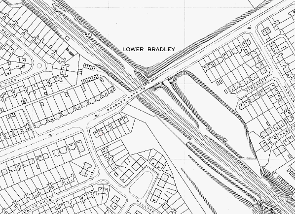 Passenger numbers were therefore never going to be high and during the First World War, along with many other minor stations around the country, Bradley & Moxley was closed as a wartime measure to release staff for military duties. The Railway Clearing House Handbook has the station closing on 29 March 1915 whereas the Railway Clearing House Chronology Group lists the date as 1 May 1915 as the station was still listed in the timetable in April 1915. As with many others the station never reopened after the cessation of hostilities although it continued to appear in Ordnance Survey maps until the early 1920s. Ironically, several new housing developments sprung up in the area around the station site from the late 1920s but by this point the station site had been levelled to allow a down (Wolverhampton direction) loop to be constructed thus increasing capacity on the twin-track section between Priestfield and Wednesbury.