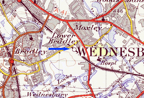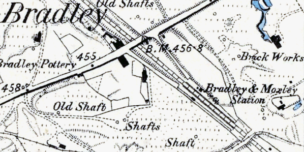 The station site was equidistant between the two settlements after which it was named, with Bradley being the larger of the two; however, the village was located closer to the former Oxford, Worcester & Wolverhampton Railway (OWWR) station, Daisy Bank, than the BWDR one. Various industries were located within walking distance of the new station, including Bradley Pottery and Regent Iron Works. The village of Moxley was located directly on Holyhead Road, now the A41 High Street, which was linked to Wolverhampton by the tram network.