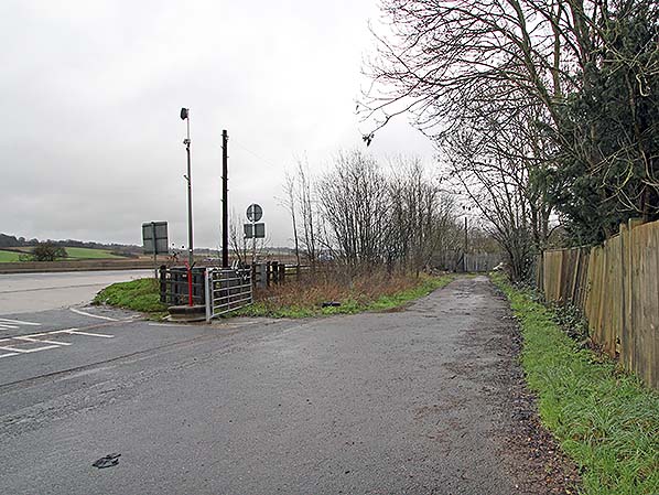 A January 2016 view looking east along the station approach road. The station was behind the trees in the centre distance and the entrance to the goods yard directly ahead. An apparently rather quiet M25 is seen on the left. The motorway access now has a gate, presumably in place of the lifting barrier which can be seen wrecked in another image.
