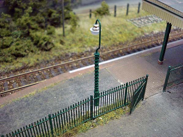 Fencing, railings, street lights and lamp hut are all brought items (why try to reinvent the wheel) the fencing has been strung using cotton. The loading gauge is Ratio but as is typical, nothing like the one at Westerham, so that came under the knife. Likewise the ringed starting signal for the goods yard. Bits of a Biro tube, a handle from the water tank and some rolled up paper, made the water crane. Platform lights are plastic rod and paper clips suitably bent, a yard light was made from plastic tube and wire, the Belisha beacons are berry pins with the plastic covering from paper clips used to make the black and white rings. Other buildings have been scaled from old photographs.