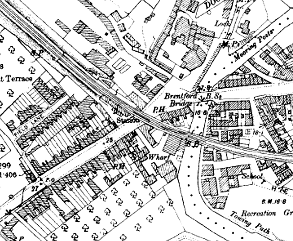 Initially the line was single track, so Brentford was provided with one platform on the up side sited on the embankment immediately north of London Road bridge. Access to the platform was by an open stairway. Initially there were no buildings, but a timber building, which included a booking office and waiting rooms, had been provided by the 1890s. From June |