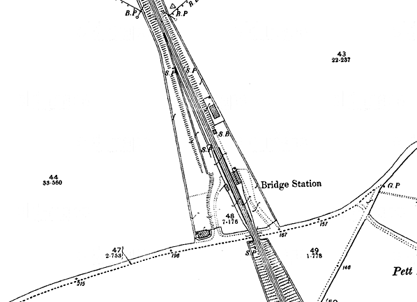 Bridge had a small goods yard which required considerable excavation of the chalk hillside. There were two sidings on the up side of the line requiring trains to reverse into the yard. One siding ran end-on to a small dock behind the north end of the up platform. The other longer siding ran behind the up platform at an angle to the main line. Access to the yard was controlled by a signal box beyond the north end of the down platform. Throughout its life passengers crossed the line using barrow crossings at both ends of the station.